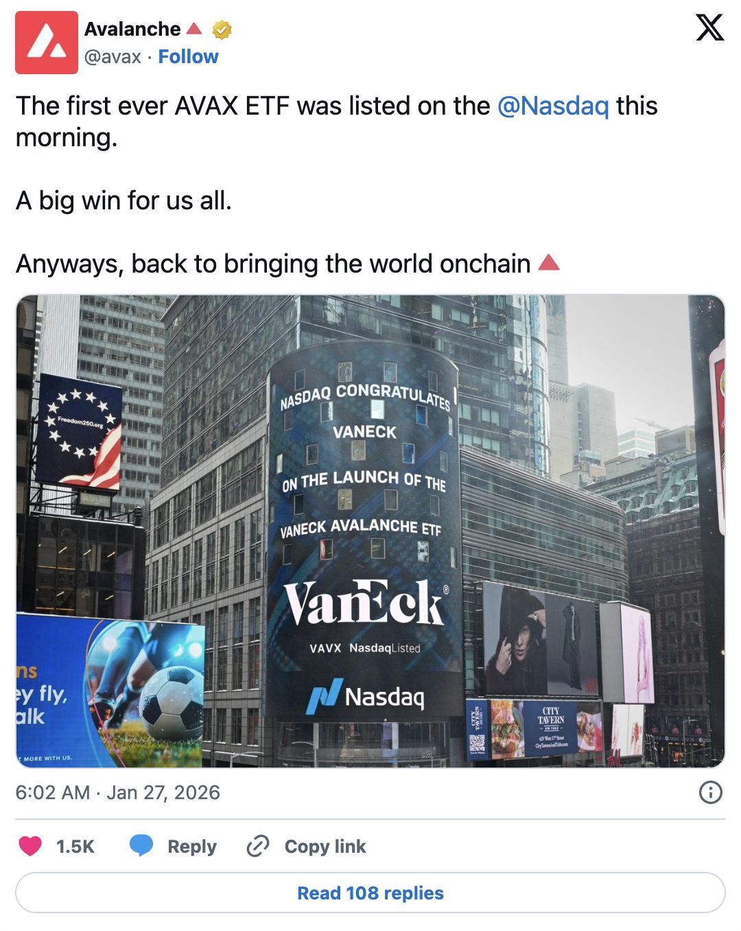 Compania globală de gestionare a fondurilor VanEck a lansat pe 26 ianuarie primul ETF cu expunere pe Avalanche, raportându-se că produsul a început tranzacționarea pe Nasdaq luni.