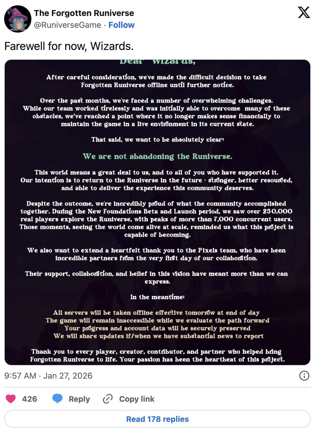 Jocul multiplayer cu temă fantastică (Forgotten Runiverse) s-a închis pe 27 ianuarie din cauza provocărilor financiare și operaționale, menționat într-un comunicat de presă al echipei (Forgotten Runiverse).