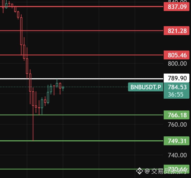如果今天反弹上不去789上方那说明小级别反弹没有力度,继续往下下方支撑位留意766-750-730这几个位置附近!#BNB走势