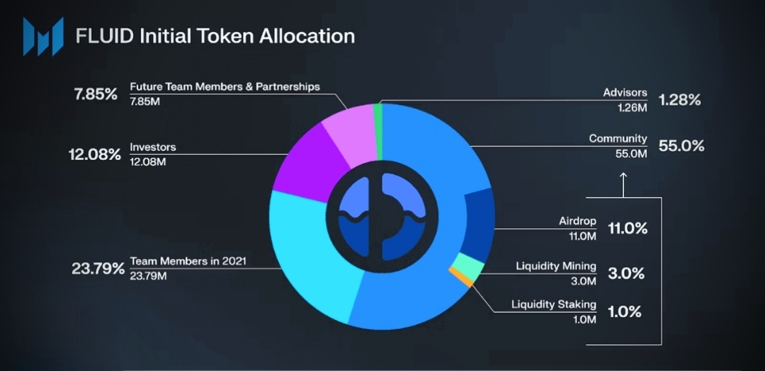 Tokenii Fluid joacă un rol important în susținerea ecosistemului, cu o ofertă totală de 10,000,000 tokeni. Acești tokeni sunt distribuiți pe diferite segmente, inclusiv vânzări, fond, trezorerie, burse/lichiditate și lichiditate Uniswap, cu alocări specifice și perioade de vesting pentru a asigura viabilitatea pe termen lung a platformei.