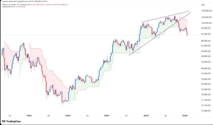 De asemenea, a format un model de steag bearish 🚩 și a coborât sub Media Mobilă Exponențială (EMA) pe 50 de săptămâni 📉 și indicatorul Supertrend 🔻. Acest model duce adesea la mai multe scăderi ⬇️, ceea ce va duce la mai multe scăderi pentru Bitcoin și piața crypto ⚠️📉.