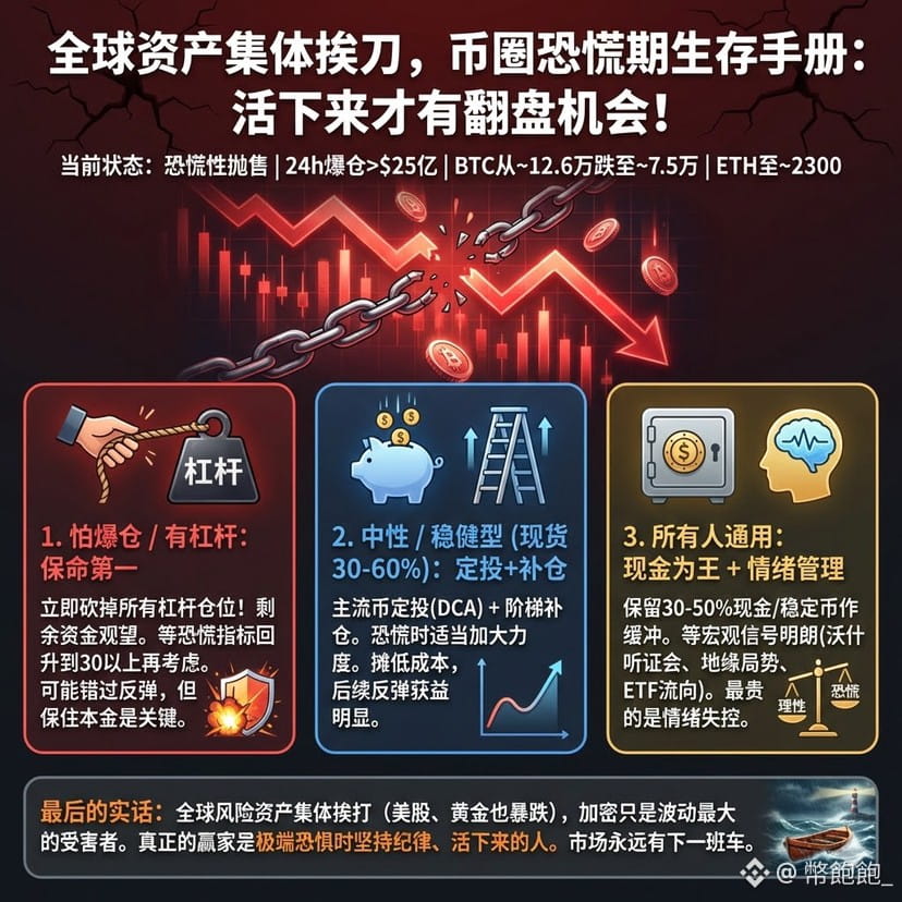* 怕爆仓 / 有杠杆:保命第一。立即砍掉所有杠杆仓位,剩余资金观望,等恐慌指标回升到30以上再考虑重新入场。可能错过部分反弹,但大概率保住本金。历史经验显示,每次大爆仓后,活下来的人才能参与下一波机会。