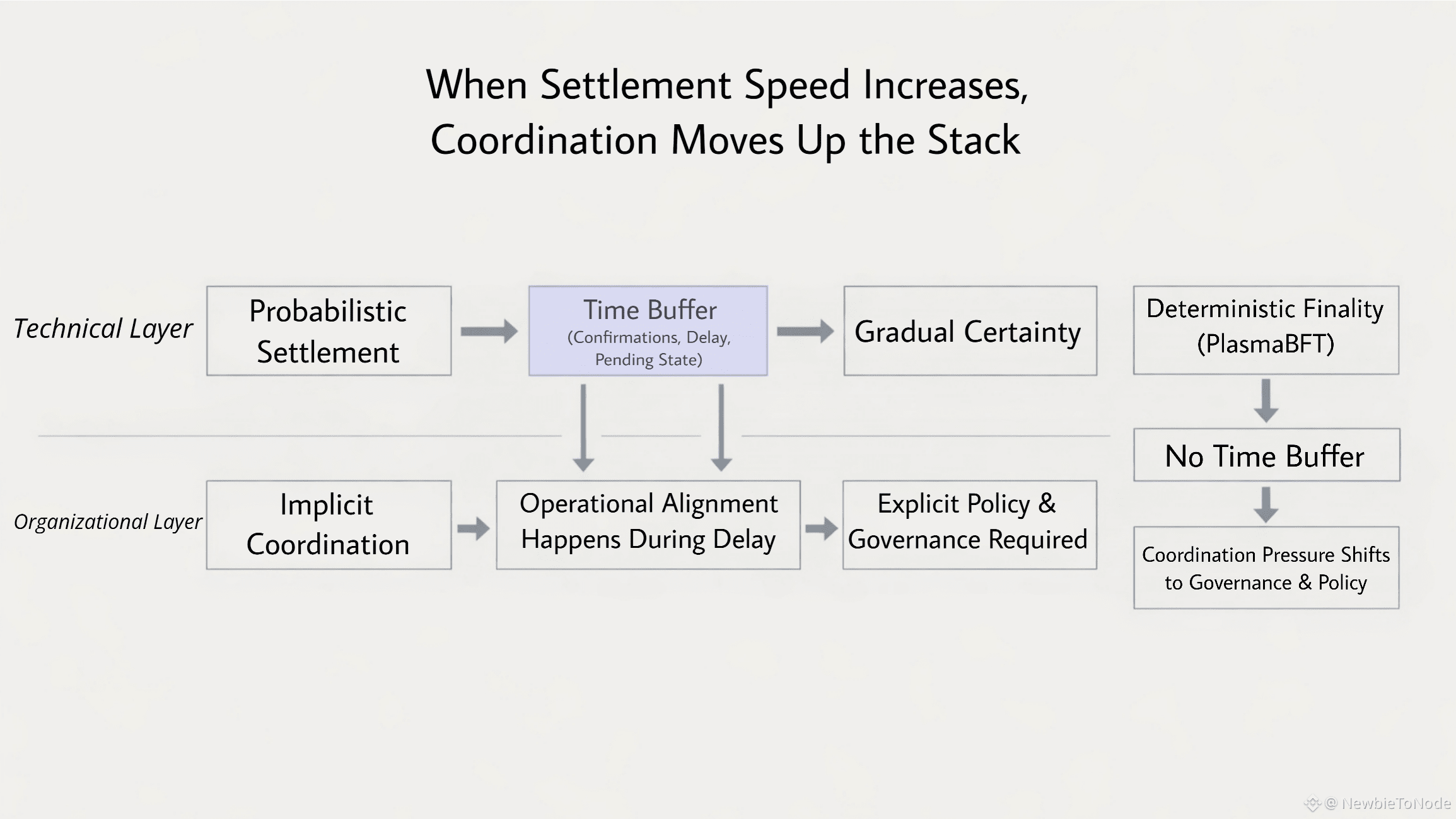 That’s why coordination pressure rises as settlement speed increases. Technical uncertainty drops, but organizational decision load increases. Teams must agree earlier. Policies must be clearer. Systems must be prepared to treat finalized state as authoritative even if internal processes are still catching up.