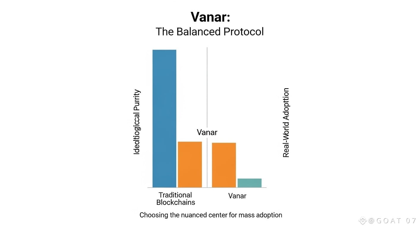 Imagine a technology stuck between two opposing forces each of them screaming its virtues into the void. On the one side, people are calling for absolute decentralization, radical transparency, pure but often inhospitable digital frontier. On the other side, both real-world governance and compliance require order, and order is like trying to put lightning into a cage. For most the choice appears to be bipolar, a choice between two competing visions for the future. Yet, silent profound evolution is being constructed by individuals who know that true adoption resides not on the edges but in the nuanced and hard to find center. This is the path taken by Vanar, a blockchain project that does not take the easy path of extremism but attempts to make a bridge wide enough for ordinary people to walk through.