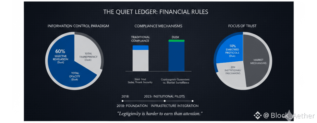 In the late 2010s, as blockchains were loudly promising to remake the world through radical transparency, a quieter question lingered beneath the noise. What happens to finance when everything is visible? Not the idealized finance of slogans and whitepapers, but the real one, built on discretion, contracts, reputations, and law. Banks do not operate in public. Asset managers do not broadcast their positions. Regulators do not need spectacle; they need assurance. Somewhere between the chaos of total opacity and the rigidity of full transparency, there was a missing system. Dusk emerged in that gap.