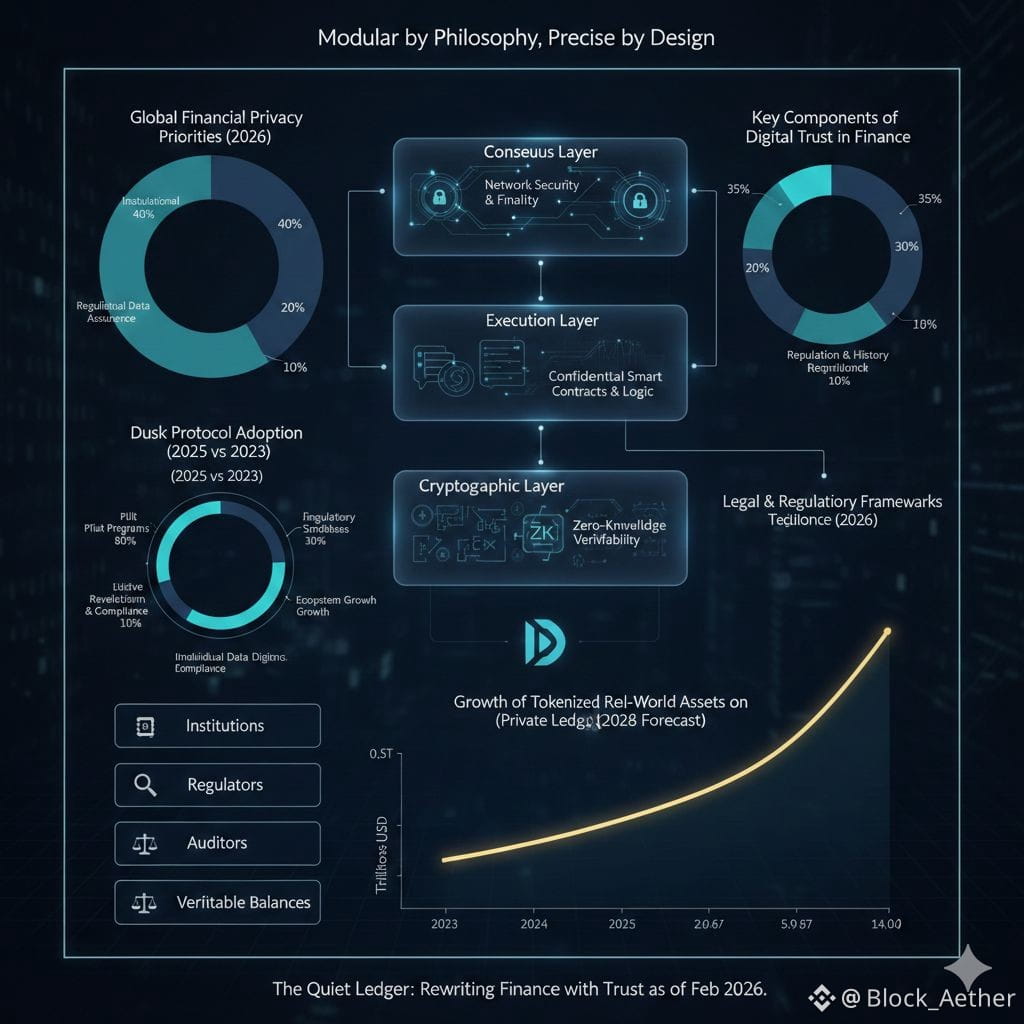 The blockchain itself is modular, not as a stylistic choice, but as a philosophical one. Finance is not a single machine; it is a layered system of custody, settlement, compliance, and enforcement. Dusk mirrors this structure. Its consensus layer secures the network. Its execution layer handles smart contracts designed with privacy at their core. Its cryptographic layer ensures that even when data is hidden, correctness is never optional. These components are not stacked carelessly. They are negotiated, like clauses in a contract.