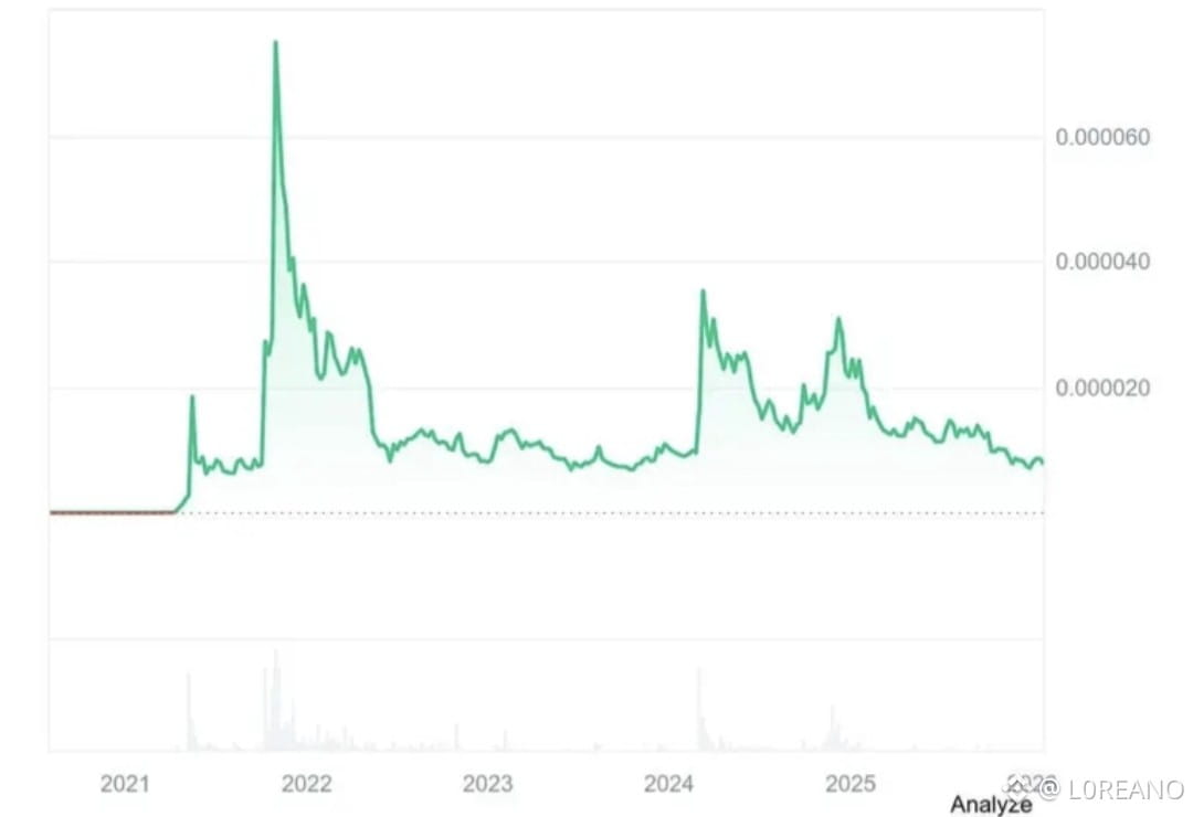 $SHIB (Shiba Inu), entré dans le top 10-20 fin 2021 → Malgré des pumps mémorables, il reste très loin de son ATH absolu (perte >90-95 % par rapport au pic 2021, et stagnant ou en déclin relatif en bear phases post-2022).