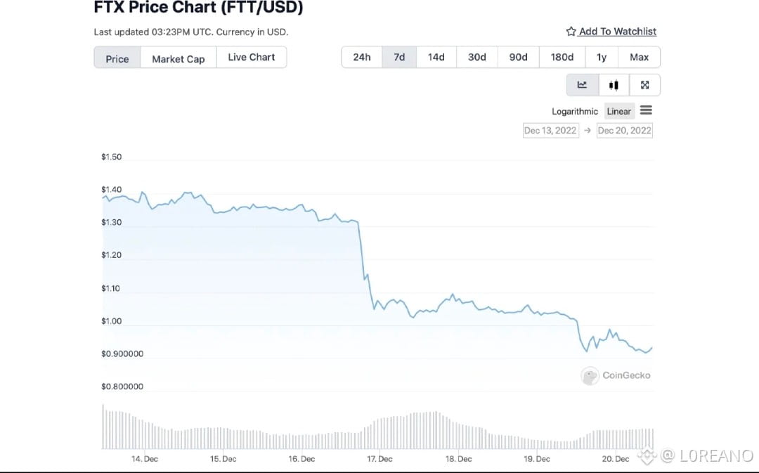 $FTT (FTX Token), top 20-30 → Complètement mort après la faillite FTX fin 2022 → Plus tradable sur les gros exchanges, valeur résiduelle nulle pour la plupart. Le collapse brutal de FTT :
