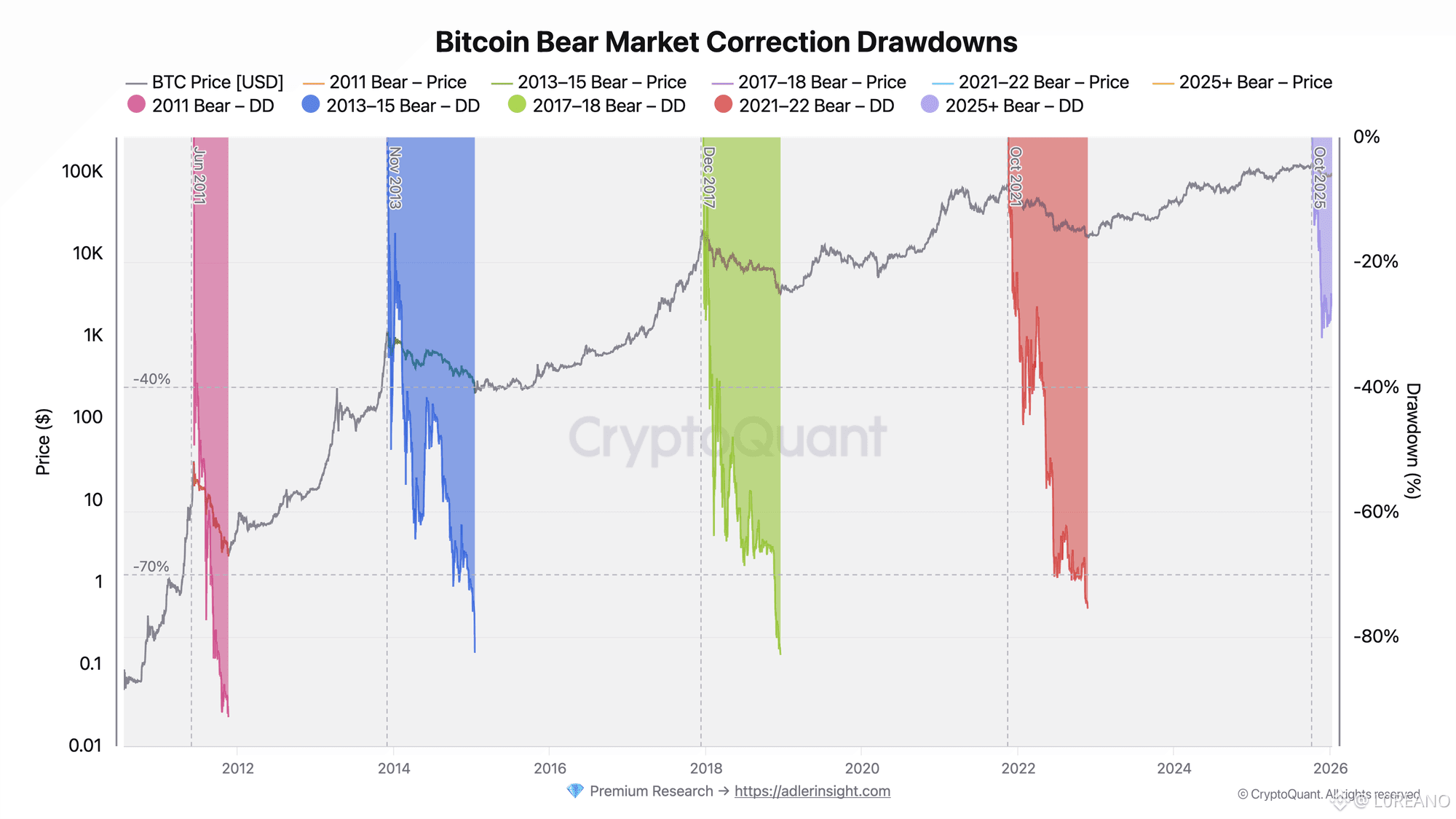Un bear market n'est pas une simple correction passagère, mais une période prolongée de baisse des prix qui altère la tendance à court, moyen ou même long terme. Il ne s'agit pas de crier au loup à chaque petite chute, une erreur courante chez certains analystes. Dans le secteur des cryptomonnaies, ces phases baissières sont cycliques et ont déjà frappé à plusieurs reprises. Le Bitcoin ($BTC ), pilier du marché, a connu des retracements massifs de -80 % à -90 % lors de bear markets passés, comme ceux de 2013-2015 et 2018-2019. Mais ces événements ne se limitent pas à ces périodes bien connues ; l'histoire des cryptos est jalonnée de tels cycles.Voici un aperçu visuel des drawdowns historiques majeurs du Bitcoin lors des bear markets :