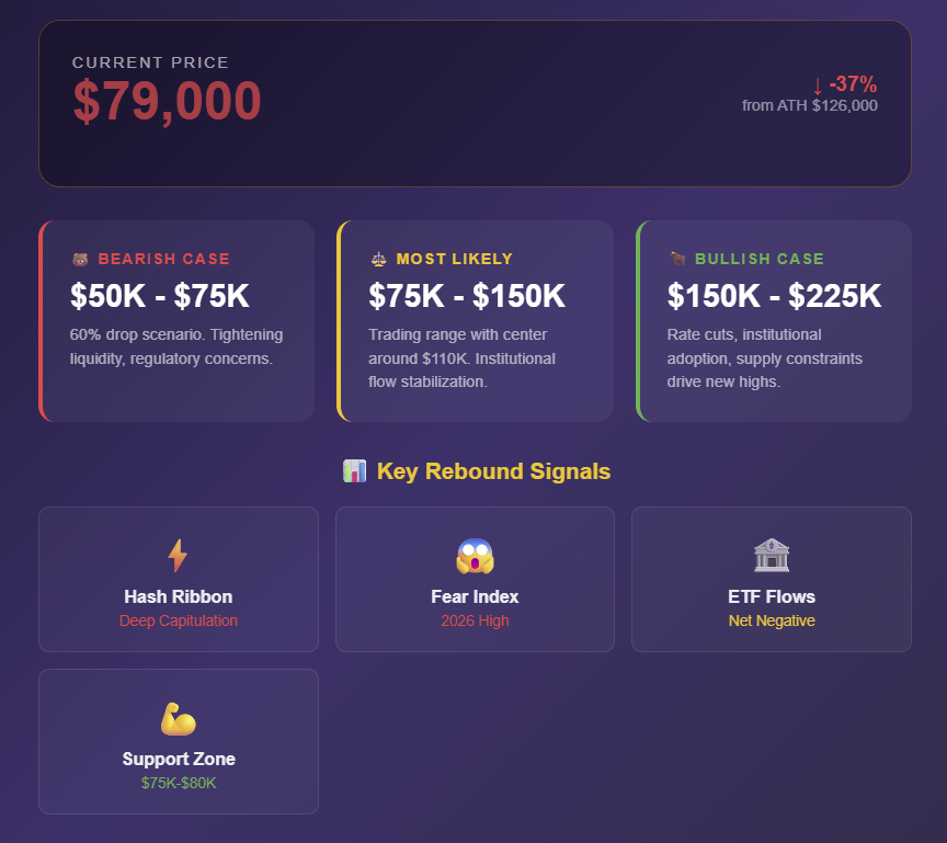 $BTC a scăzut de la $126,000 în octombrie 2025 la aproximativ $79,000 astăzi—o scădere de 37%. ETF-urile Spot Bitcoin au înregistrat fluxuri negative săptămâna aceasta, iar efectul de levier se desfășoară pe piețele de derivate.