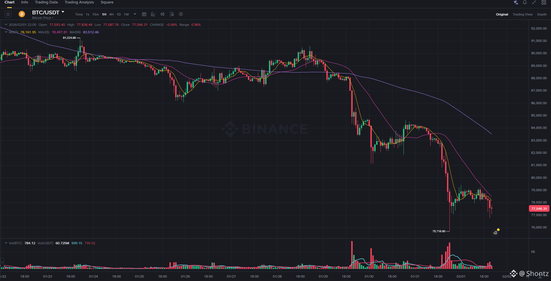 Bitcoin is currently trading near $77,500, following a sharp multi-day sell-off. Volatility has expanded significantly, and price is now trading well below recent highs. This phase usually shifts the market from trend continuation into reassessment.