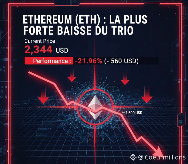 L'Ether accuse le coup. Alors que le marché global se contracte, Ethereum enregistre la correction la plus sévère du top 3. Voici ce qu'il faut retenir de cette chute vertigineuse :
