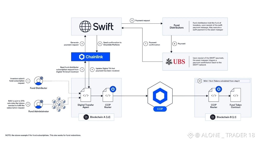DTA and DvP: The Digital Transfer Agency (DTA) smart contract facilitates the transfer of the tokenized fund, while the Delivery vs Payment (DvP) workflow enables the atomic swap of the stablecoin for the tokenized fund. Both DTA and DvP are end-to-end solutions that combine various services to support the use case’s lifecycle. They will soon be supported by the Chainlink platform.