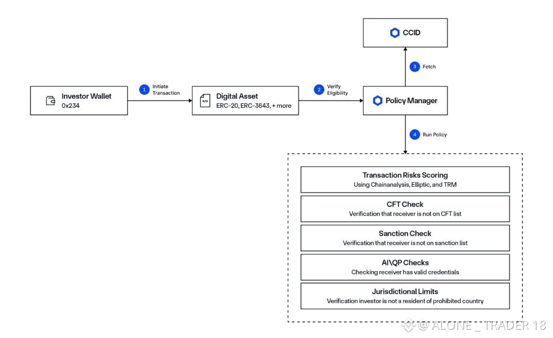 Solution: The Chainlink compliance standard, powered by the Onchain Compliance Protocol (OCP). OCP is an open, protocol-level specification defining how to utilize DONs to define and store compliance data onchain and utilize identity data and policies in smart contracts. OCP allows existing identity systems (e.g., GLEIF’s vLEI, ERC-3643) to be integrated with onchain infrastructure via the Cross-Chain Identity (CCID) framework, with policies enforced onchain and offchain using the Policy Manager. Compliance policies can be embedded directly within smart contracts and any token type, credentials can be verified without exposing personal data, and identity attestations can be coordinated across blockchains and jurisdictions. This is enabled by CCT and its compliance extension, which functions as a connector between smart contracts and CCID and the Policy Manager.