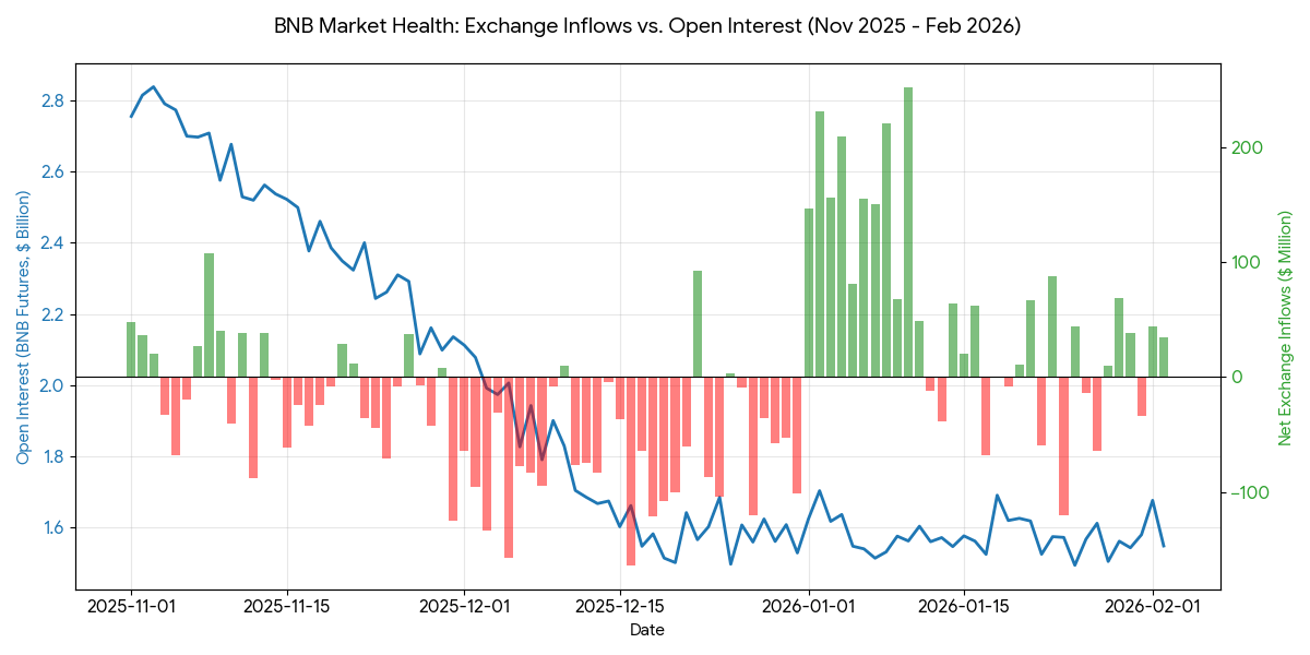 Datele on-chain și cele derivate au arătat inflow-uri mari de BNB către burse tocmai când prețul își pierdea un interval critic. În același timp, interesul deschis a rămas ridicat, ceea ce înseamnă că piața era deja întinsă.