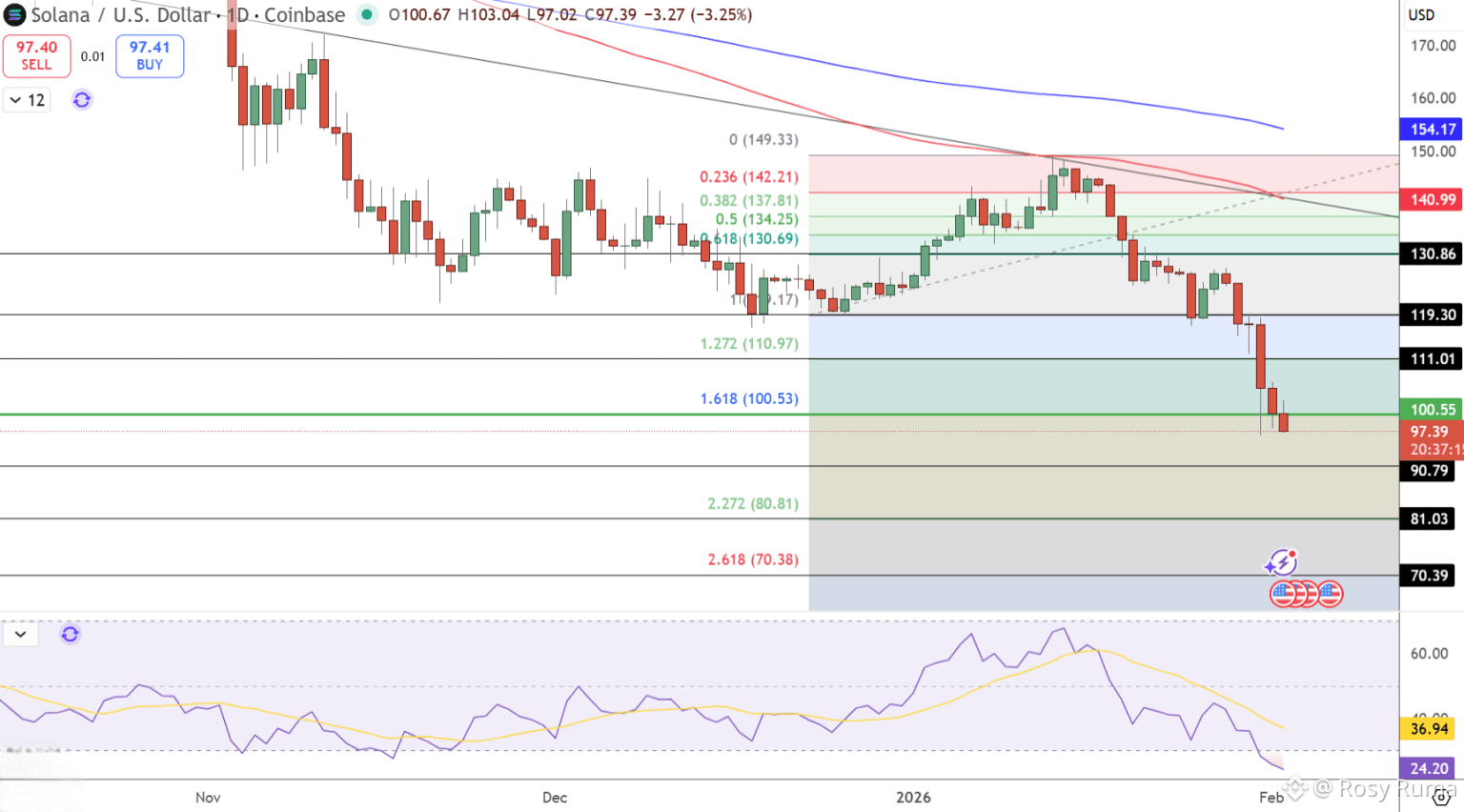 From a technical perspective, SOL remains in a short-term downtrend, trading within a descending channel that began in late 2025. Once price broke below the 100-day and 200-day EMAs near $140, it quickly slipped through $119 and $111, suggesting forced liquidation rather than healthy profit-taking.