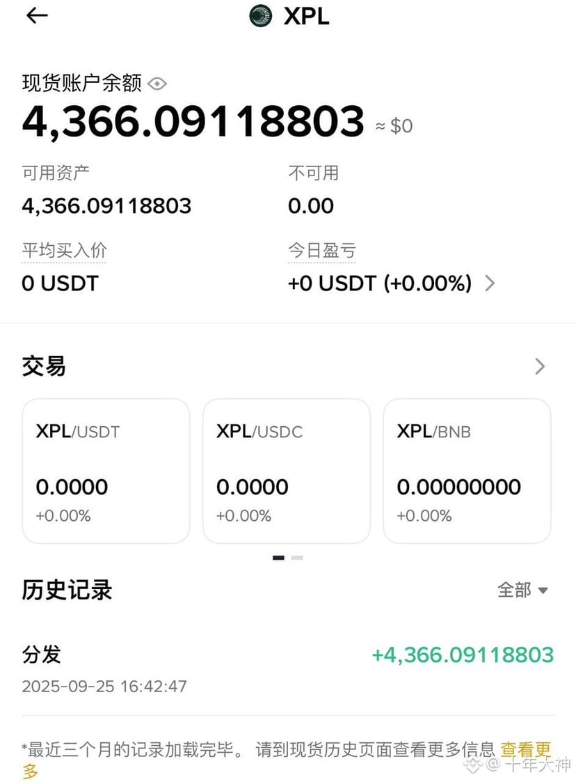有人把1 USDT存进$XPL ,一觉醒来账户里多了9,304 枚XPL,按场内暂报1.04 USDT算,那就是9,600 美元,近七万人民币。评论区瞬间炸锅,“1 U 变 1 万”的神话像病毒一样裂变,FOMO 情绪拉满。笔者打开链上浏览器,发现同一批地址几乎收到等量级空投,数量精确到小数点后八位,4,366.09、9,304.05、13,112.11……像极了一场提前写好的剧本。