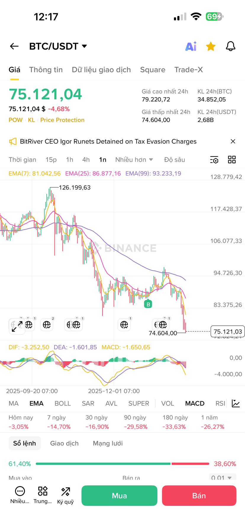 Luni dimineața (02/02/2026), BTC a primit din nou o lovitură puternică, aducând prețul în zona 75.xxx – cel mai scăzut nivel de la dip-ul recent.