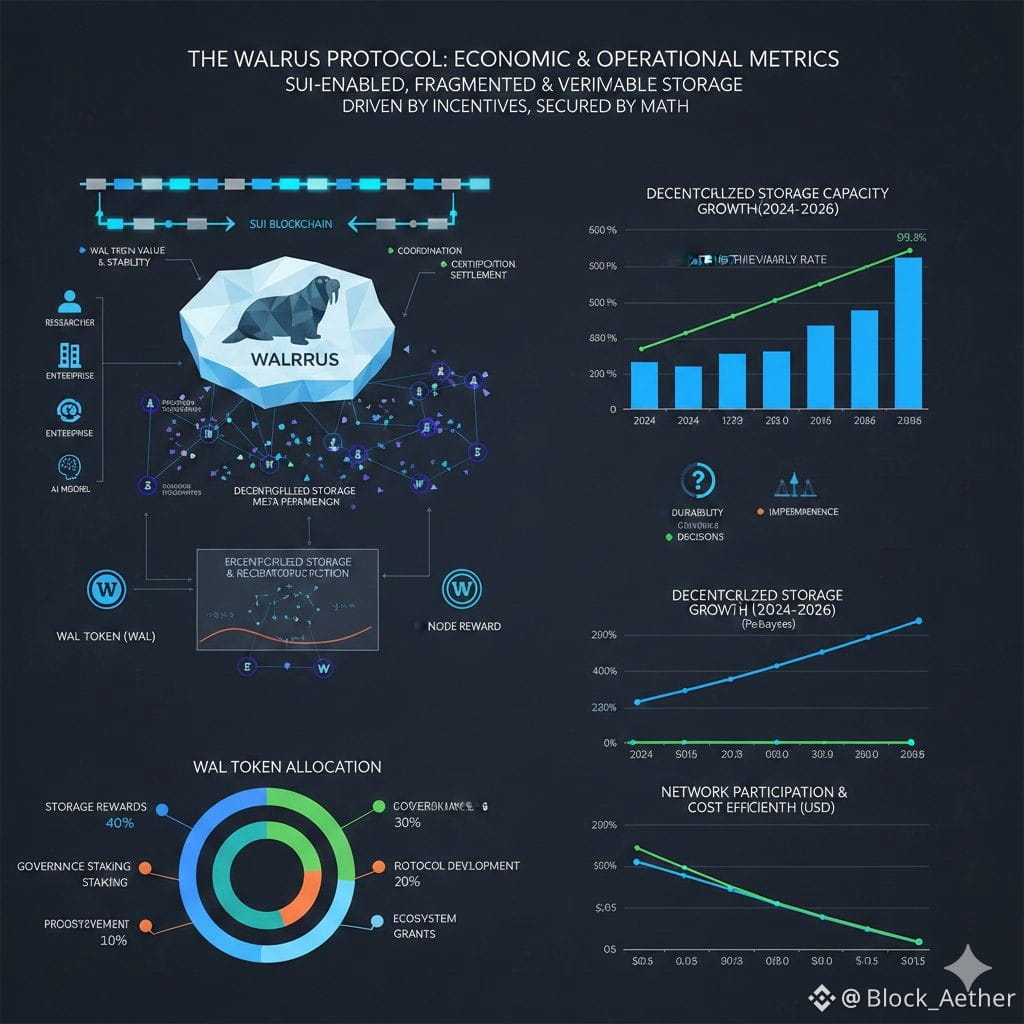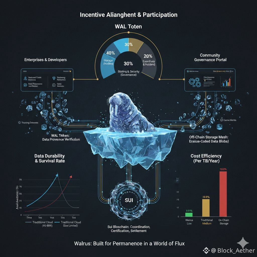 But storage alone is never just storage. Every byte lives inside an incentive structure. Walrus introduces WAL, its native token, not as a speculative flourish but as connective tissue. WAL pays for storage. WAL rewards the nodes that hold fragments. WAL gives its holders a voice in how the protocol evolves. This matters because decentralized systems fail most often not because of bad code, but because incentives drift. If storing data becomes unprofitable, nodes leave. If governance becomes opaque, trust erodes. WAL is meant to keep those forces aligned over time, even as the network grows and conditions change.