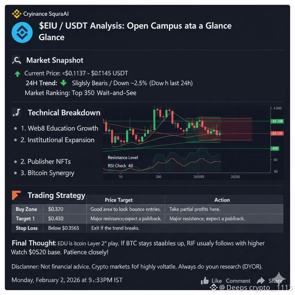 The Open Campus (EDU) protocol is currently navigating a period of consolidation. As of 3:33 PM today, February 2, 2026, here is the breakdown of what's happening with the "Education Layer" of Web3.