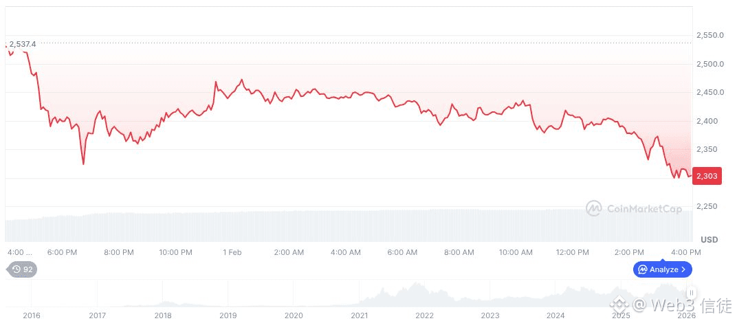 以太坊 (ETH) 目前交易价格为 2,254.75 美元,市值为 272,133,748,420。根据 CoinMarketCap 的数据,截至 2026 年 2 月 2 日,ETH 的价格在过去 90 天内下跌了 37.91%。过去 24 小时内,交易量下降了 5.49%,流通供应量达到 120,693,748。