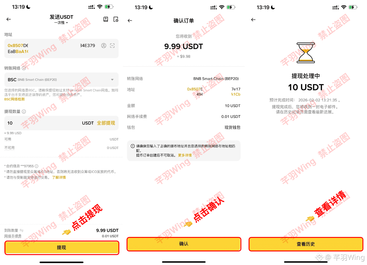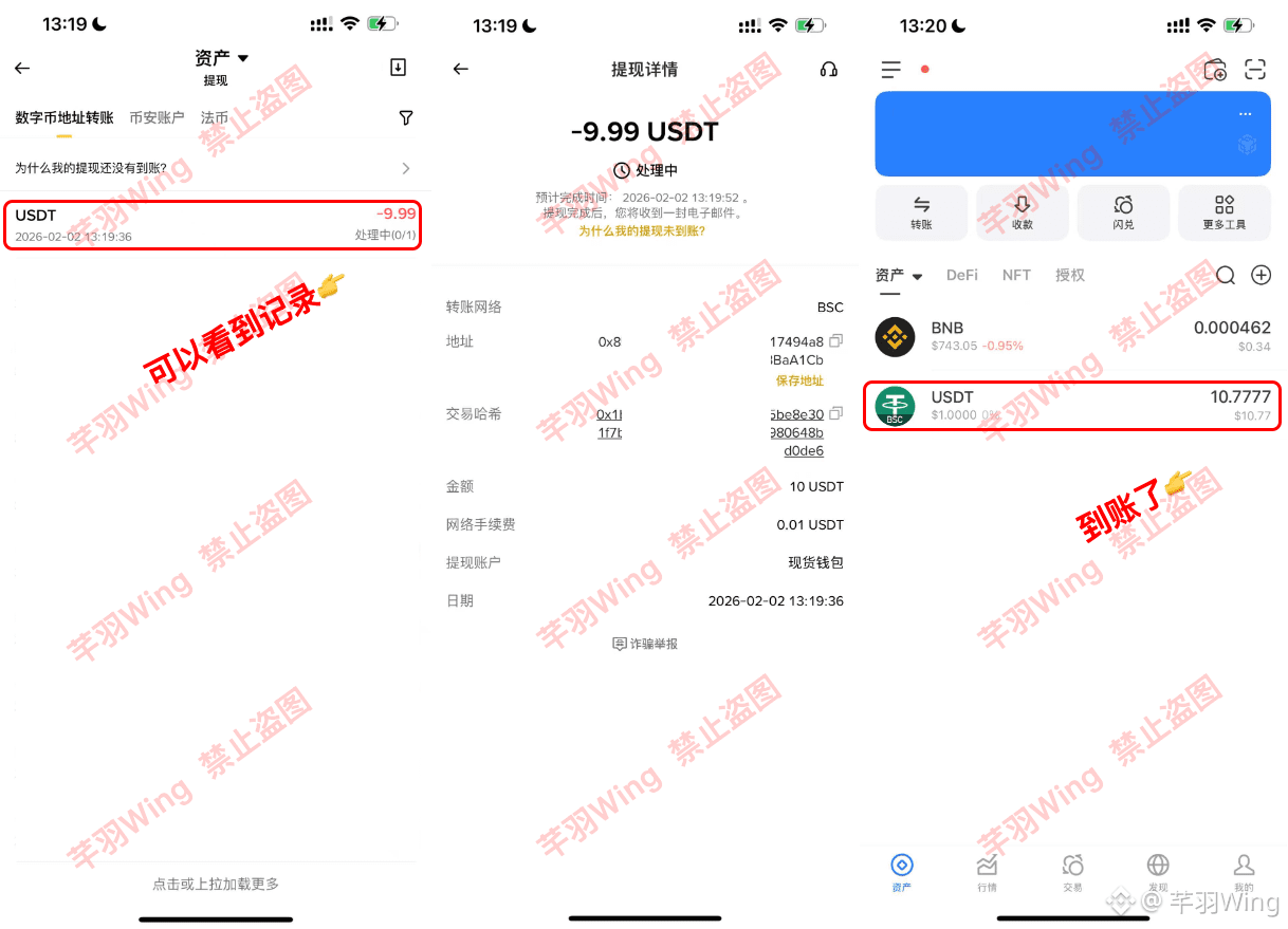 5、查看提现详情,回到钱包查看是否到账,BSC网络很快!