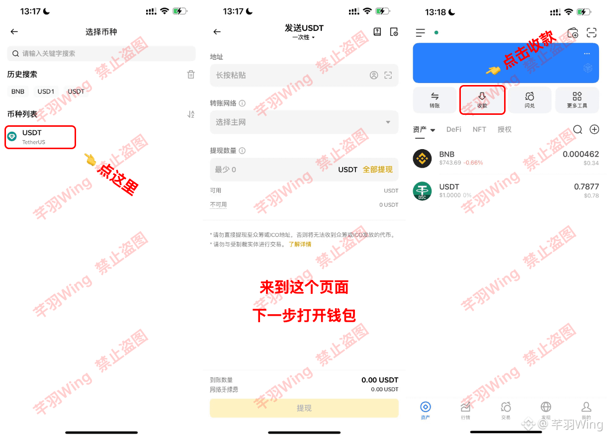 2、选择USDT,钱包内点收款