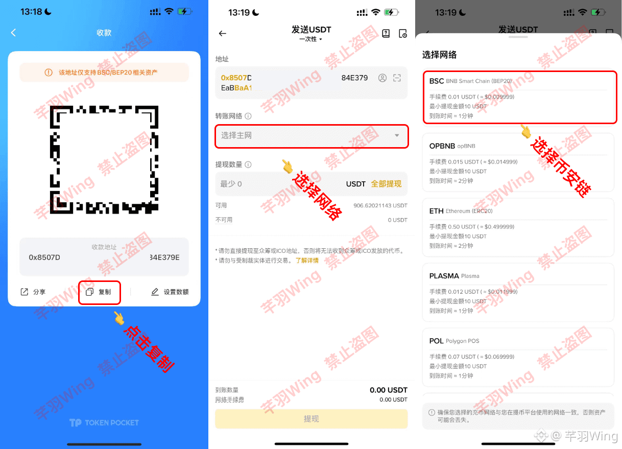 7、选择BSC网络,复制钱包地址,打开钱包