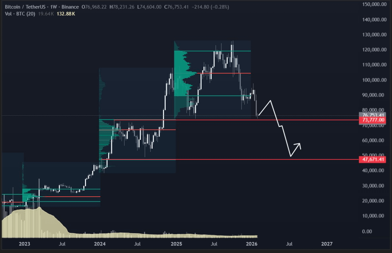 În prezent, BTC ~76k, se află la suport dar nu mai este puternic: