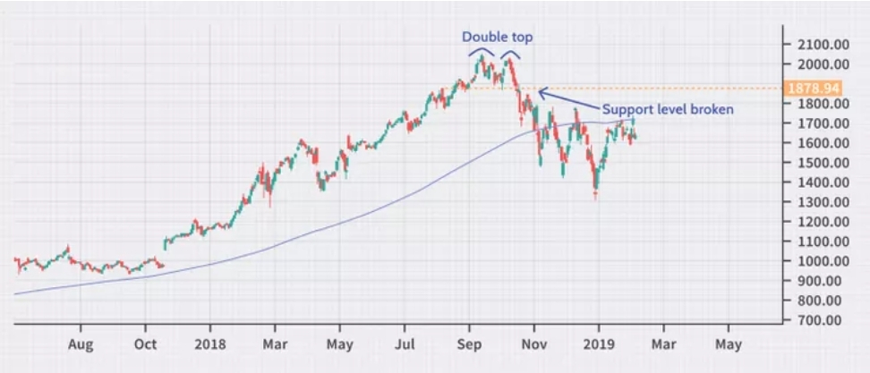A format un model de dublu vârf (prețul atinge aceeași înălțime de două ori, dar nu reușește să treacă mai sus)