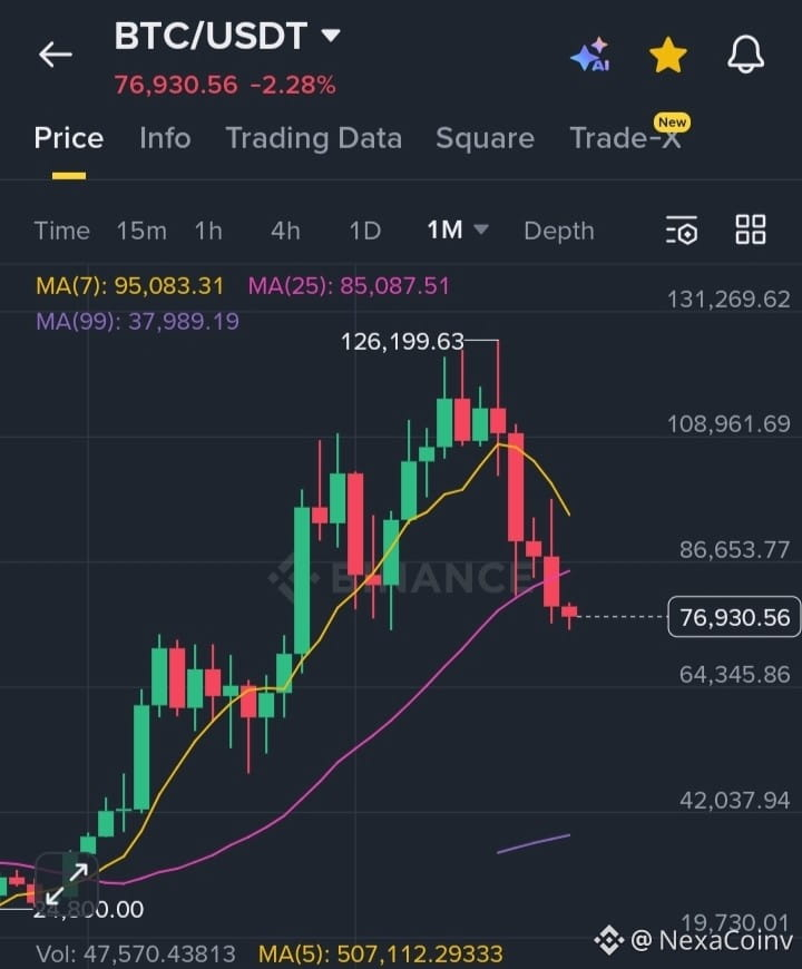 The digital asset market has entered a period of intense turbulence as Bitcoin (BTC) continues its sharp descent from its October 2025 all-time high. After reaching a staggering peak of $126,199, the "king of crypto" has retreated nearly 40%, recently sliding below the critical $76,000 support level.