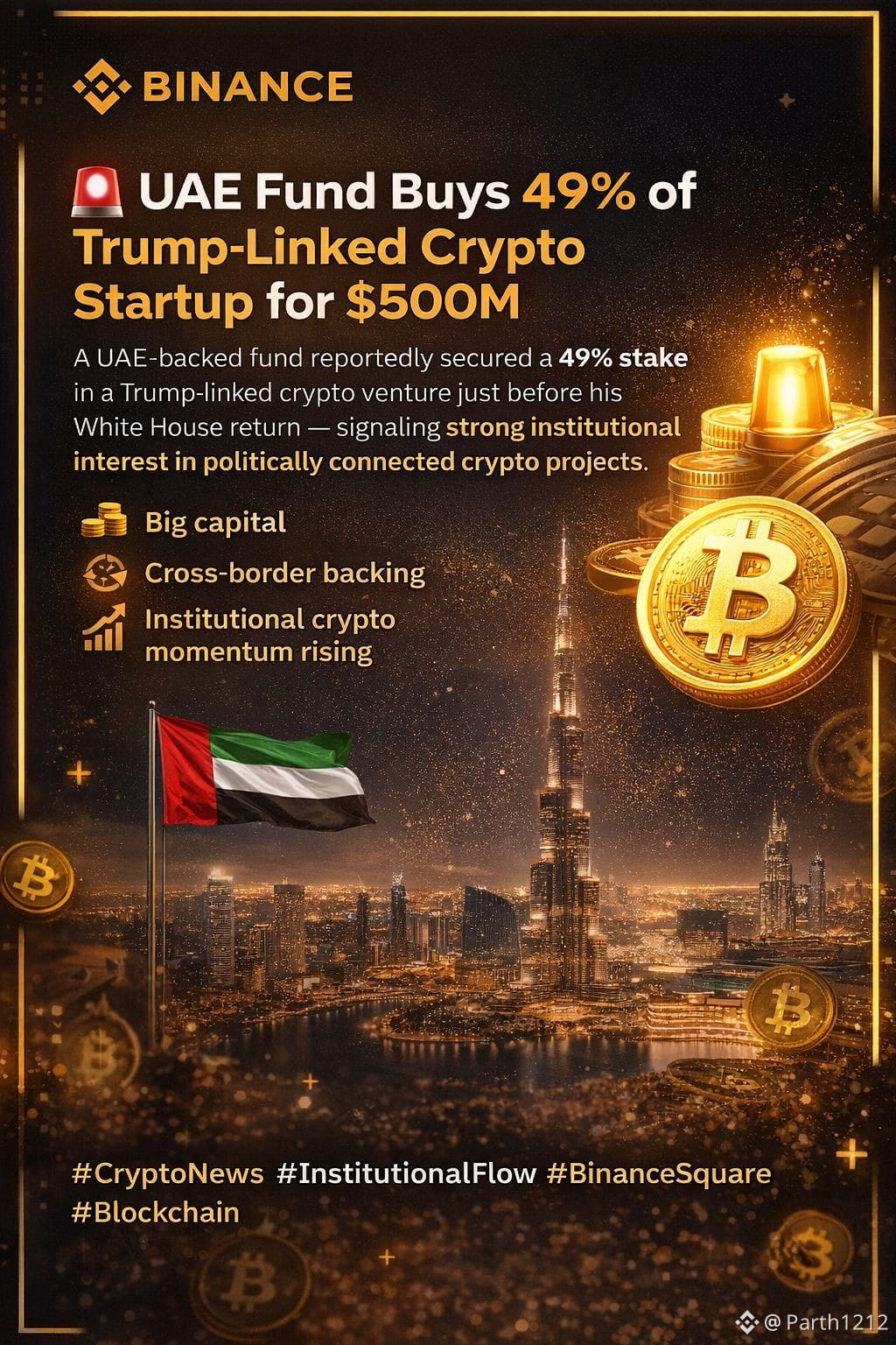 A UAE-backed fund reportedly secured a 49% stake in a Trump-linked crypto venture just before his White House return — signaling strong institutional interest in politically connected crypto projects.