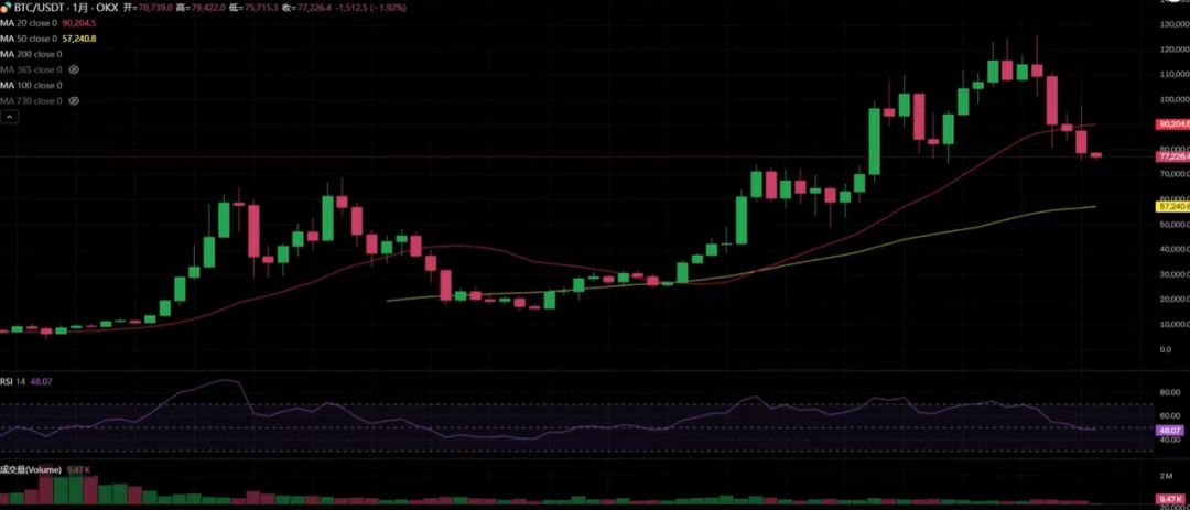新的一周在恐慌中开场。周末比特币经历了剧烈波动,累计跌幅近 10%,不仅击穿了心理防线,更在技术面上确认了中期熊市的延续。
