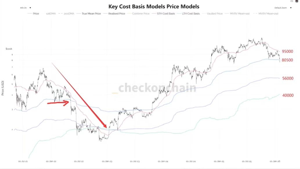• 这是 200 周均线(MA200)与比特币“实现价格”(Realized Price,约 $56k)的重合区。