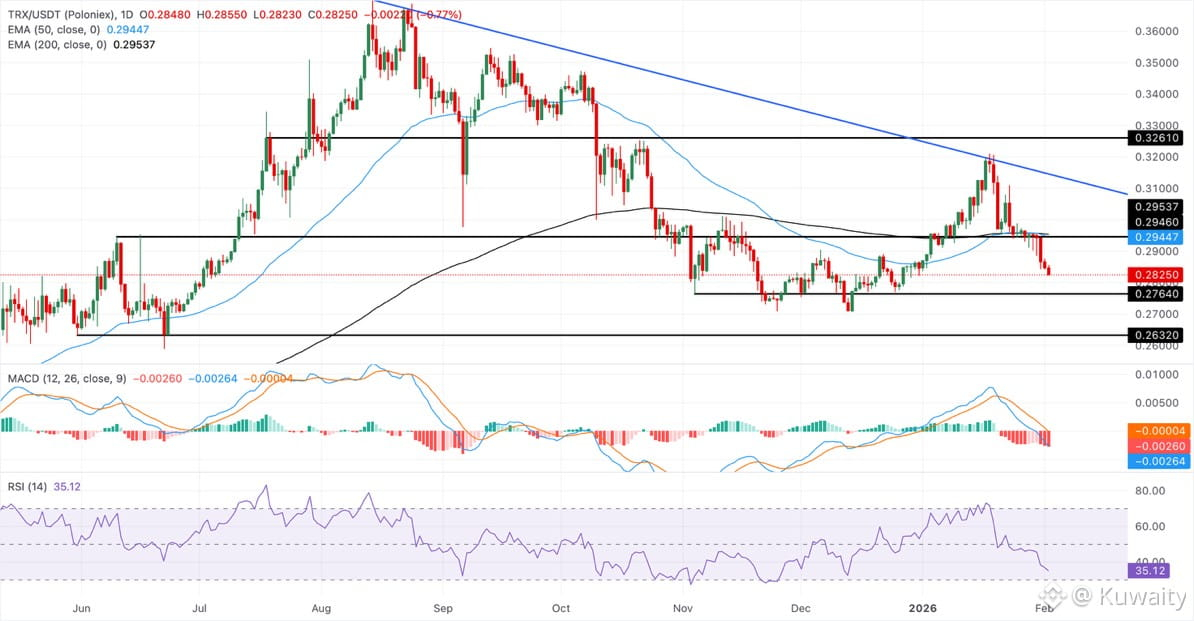 بالنظر إلى الأسفل، يقع أقرب دعم لترون عند قاع 4 نوفمبر عند 0.2764 دولار، يليه منطقة أعمق عند 0.2631 دولار.