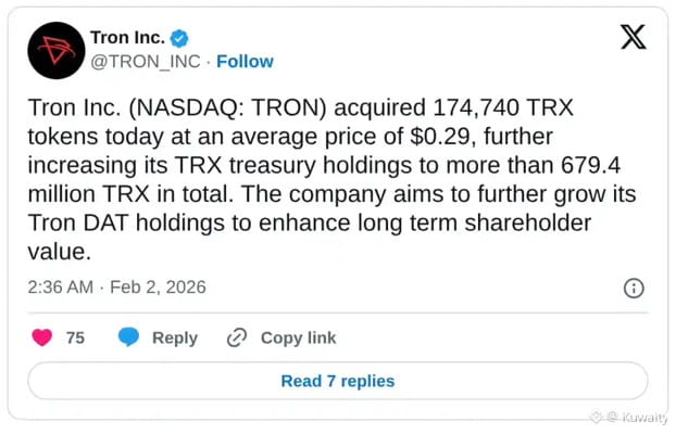 استحوذت شركة ترون، وهي خزينة الأصول الرقمية (DAT) التي تركز على $TRX ، على 174,740 رمز TRX يوم الاثنين بسعر متوسط قدره 0.29 دولار لزيادة حيازاتها إلى أكثر من 679 مليون رمز إجمالاً. عادةً ما يخفف الشراء من DAT الضغط على معنويات التجزئة، ولكن في السوق الحالية، تظل ترون تحت الضغط.
