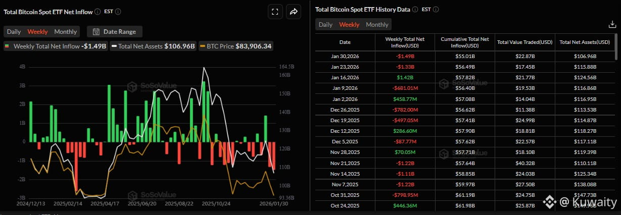 تم دعم انخفاض سعر البيتكوين بشكل أكبر من خلال تراجع الطلب المؤسسي. يظهر الرسم البياني SoSoValue أدناه أن صناديق الاستثمار المتداولة في البيتكوين الفوري (ETFs) سجلت تدفقات خارجة إجمالية بقيمة 1.49 مليار دولار الأسبوع الماضي، مما يمثل ثاني أسبوع متتالي من التدفقات الخارجة. على الرسم البياني الشهري، بلغت عمليات السحب في يناير 1.61 مليار دولار، مما يمثل ثالث شهر متتالي من التدفقات الخارجة. إذا استمر الطلب المؤسسي في الضعف والتصاعد، فقد يشهد BTC مزيدًا من التصحيح.