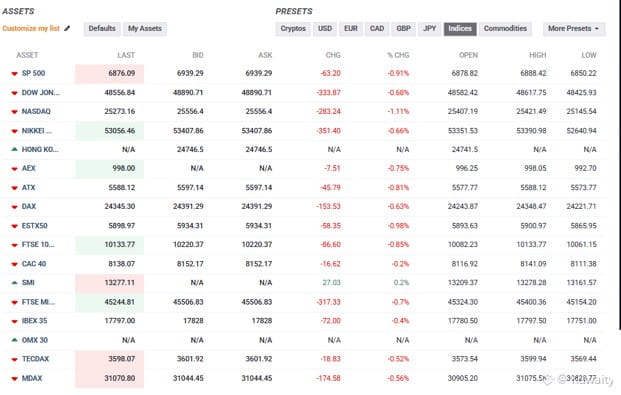 يبدأ سعر البيتكوين الأسبوع بنغمة سلبية، حيث انخفض إلى ما دون 75000 دولار خلال جلسة التداول الآسيوية المبكرة يوم الاثنين. كما يفتح السوق العالمي الأسبوع بنغمة سلبية، حيث تتداول المؤشرات الرئيسية باللون الأحمر في وقت كتابة هذا التقرير خلال الجلسة الأوروبية المبكرة، كما هو موضح في الرسم البياني أدناه.