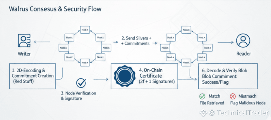 If a node tries to serve "fake" data, the commitments (those digital fingerprints we mentioned) will immediately flag it. The rest of the Walrus network will see the mismatch. In this way, Walrus creates a self-healing, self-policing environment.