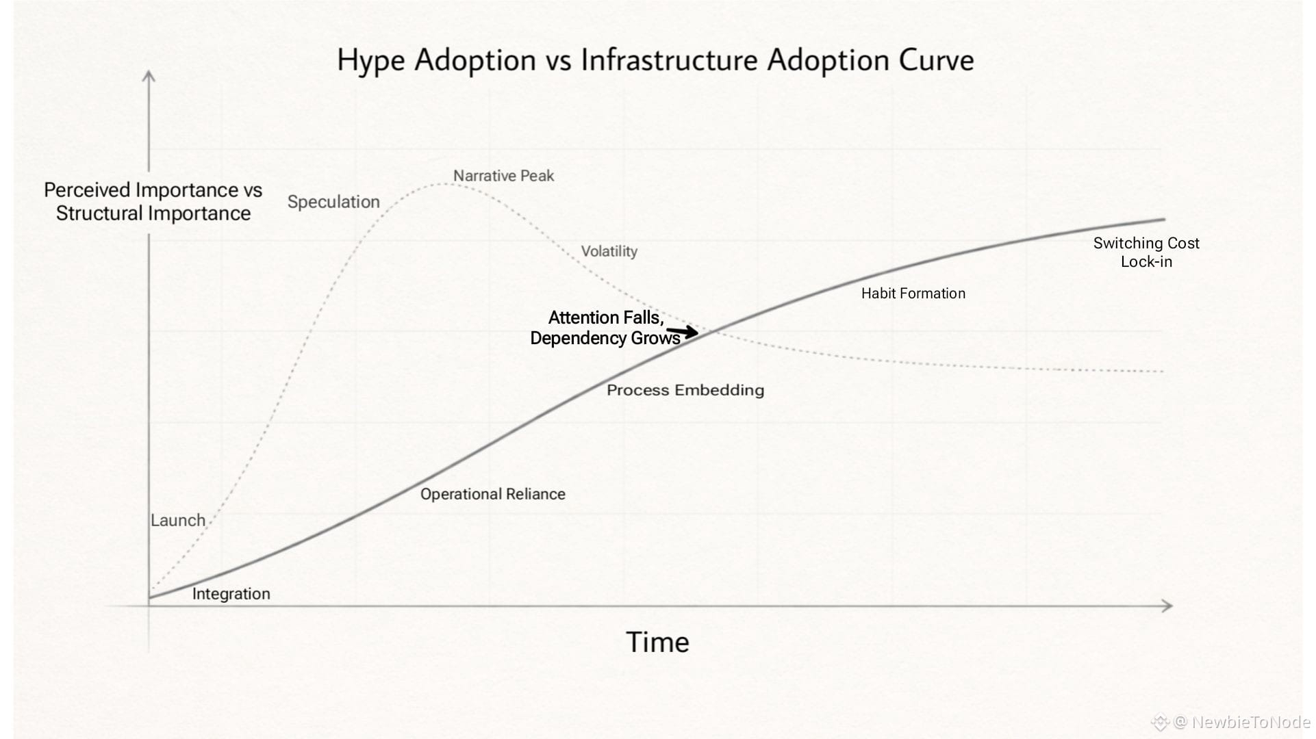 User platforms grow through excitement. Infrastructure grows through dependency. Once systems depend on you, switching costs rise quietly, but so do expectations.