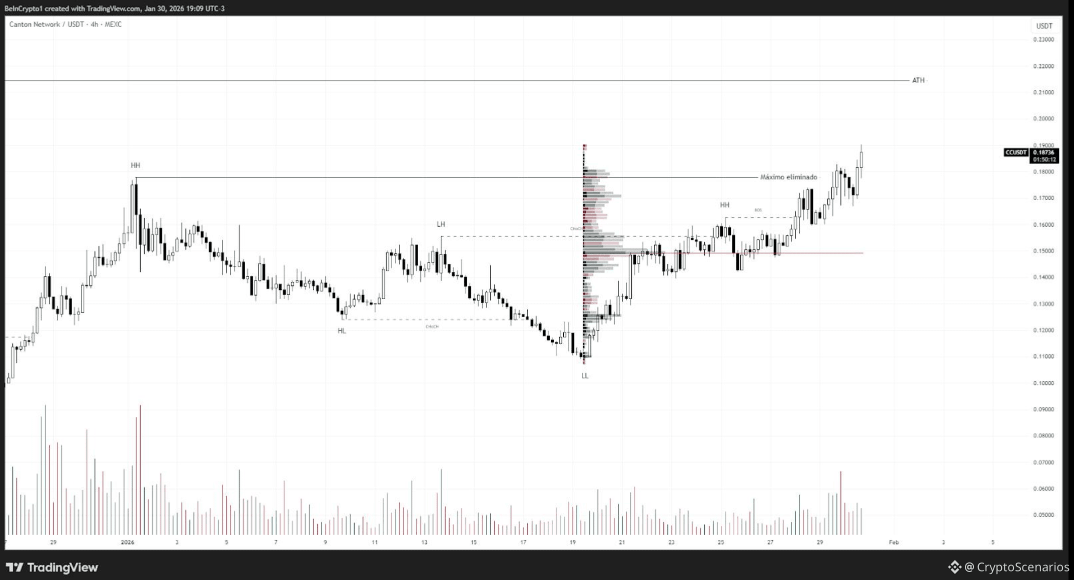 Canton Network ha ganado protagonismo tras eliminar una resistencia histórica y consolidar por encima de ella. El gráfico muestra una secuencia ordenada de máximos y mínimos crecientes, con aceptación clara del precio sobre el nivel de 0.15 USDT.