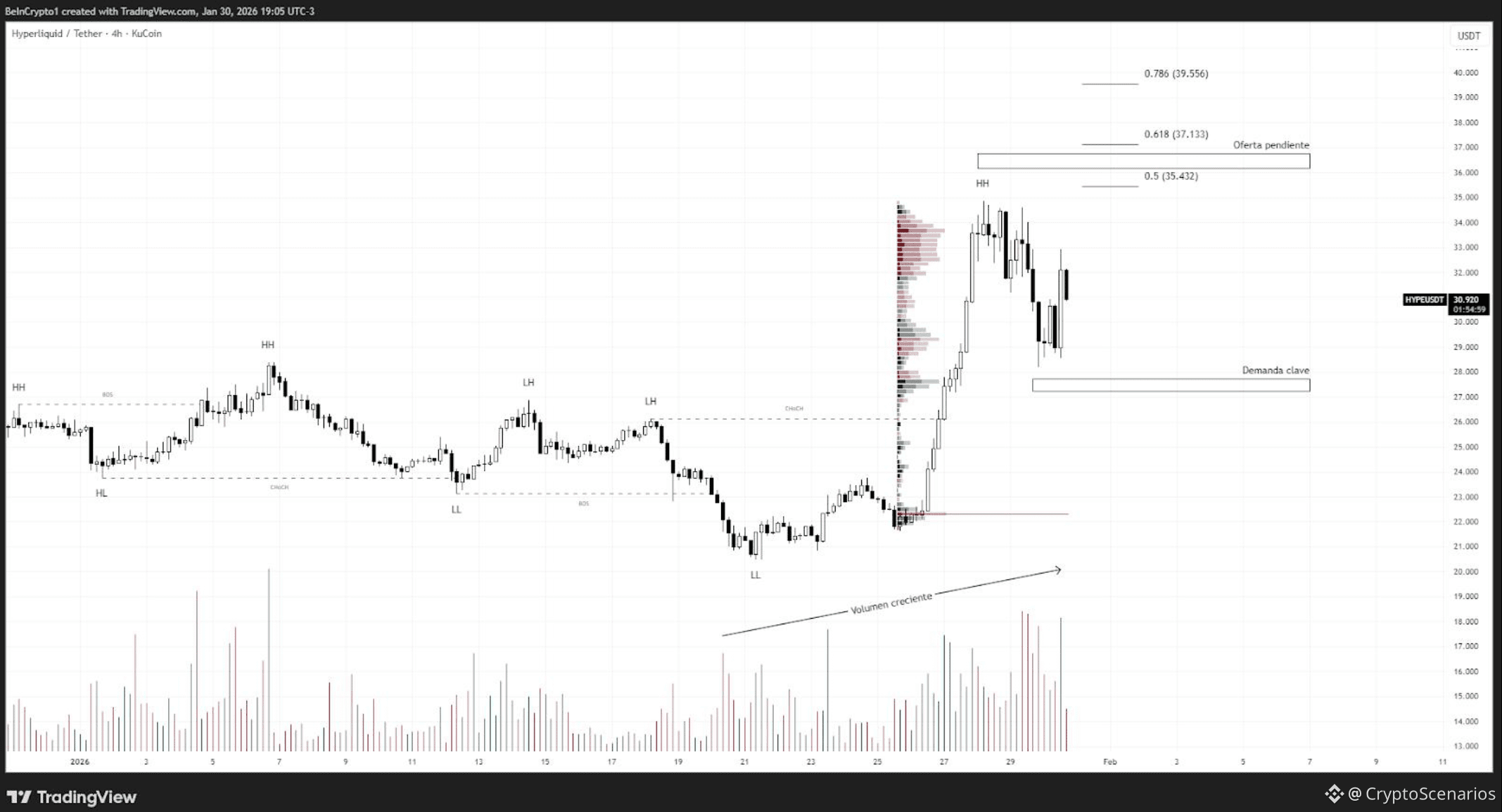 Hyperliquid es, de los tres activos analizados, el que presenta la estructura más clara. Tras un impulso alcista fuerte, el precio logró romper máximos previos y actualmente se mantiene consolidando sobre una zona de demanda bien definida.