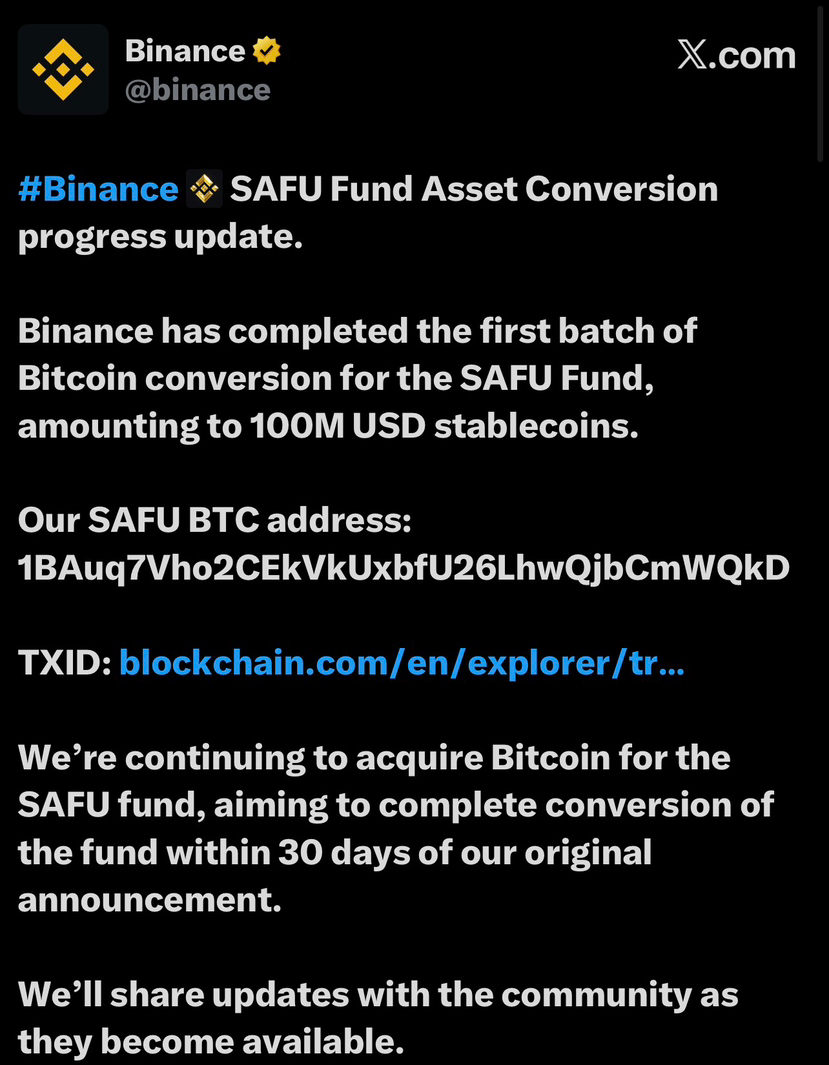 Binance a achiziționat 1,315 $BTC în cadrul noului său plan de conversie SAFU de 1 miliard de dolari, achiziționând 1,315 BTC, evaluat la aproximativ 100,7 milioane de dolari.