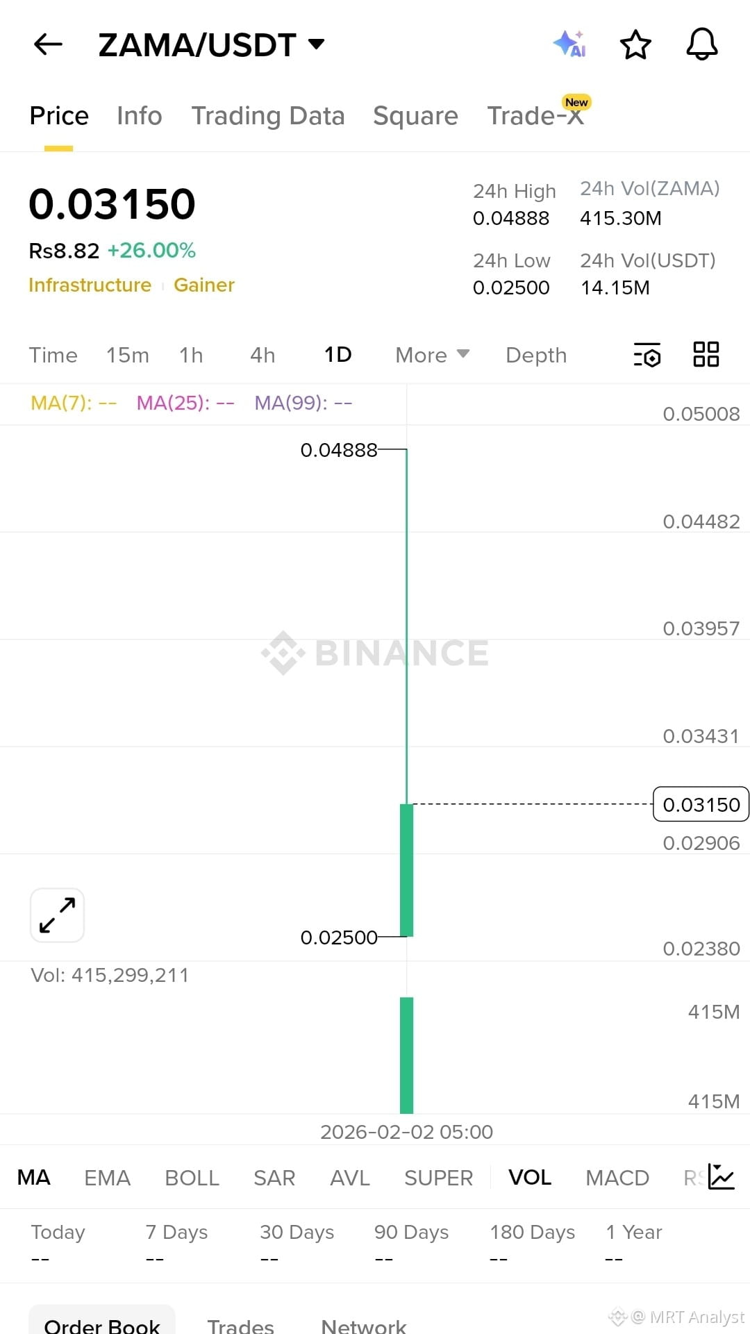 Volume: Huge volume of 415M ZAMA ($14M USDT) in the first few hours, indicating high liquidity and trader interest.