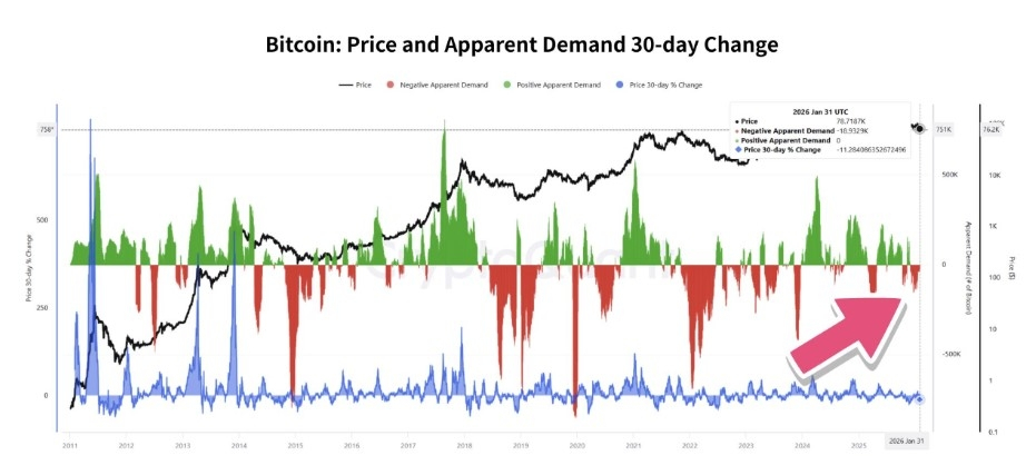 Schimbarea pe 30 de zile în $BTC Cererea Aparentă arată semne timpurii de stabilizare după o perioadă extinsă de citiri negative.