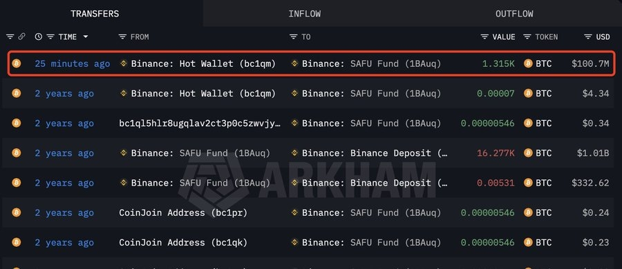 Binance a mutat 1.315 bitcoin în valoare de aproximativ 100 milioane de dolari din portofelul său cald în fondul SAFU. Aceasta este prima parte a planului bursei de a converti întregul fond de urgență de 1 miliard de dolari din stablecoin-uri în bitcoin. Planul de achiziție pe 30 de zile va crea aproximativ 33 milioane de dolari în cerere zilnică de bitcoin, pe măsură ce Binance cumpără în timpul scăderii.