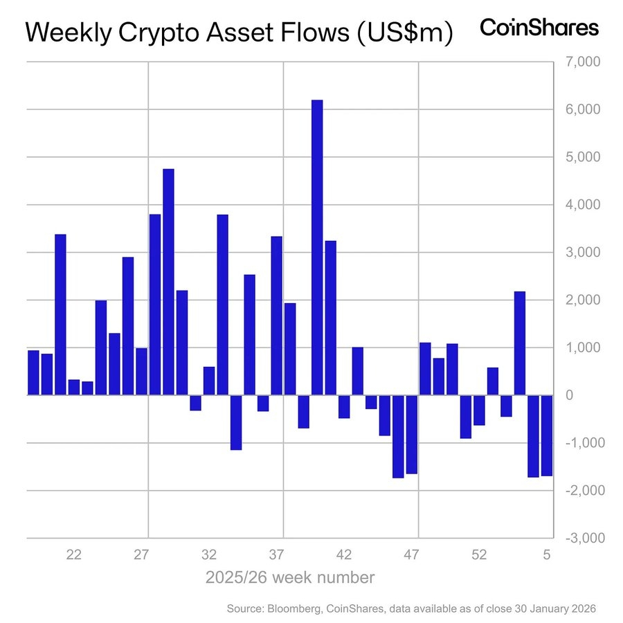 Fondurile de active digitale au pierdut 1,7 miliarde de dolari săptămâna trecută, în a doua săptămână consecutivă de vânzări masive. Fluxurile de capital au șters toate câștigurile de la începutul anului și au dus fluxurile nete la -1 miliard de dolari, conform CoinShares. Totalul activelor gestionate a scăzut la 165,8 miliarde de dolari, cu 73 miliarde de dolari mai puțin față de maximele din octombrie, pe măsură ce investitorii au retras bani în contextul numirii lui Kevin Warsh în funcția de președinte al Fed și a creșterii incertitudinii.