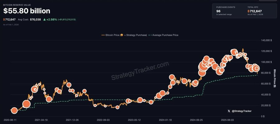 Strategia a cumpărat 855 bitcoin pentru 75,3 milioane de dolari la un preț mediu de 87.974 de dolari între 26 ianuarie și 1 februarie. Deținerile totale se ridică acum la 713.502 BTC, în valoare de aproximativ 56 de miliarde de dolari. Compania a finanțat achiziția prin vânzarea a 673.527 de acțiuni MSTR pentru 106,1 milioane de dolari săptămâna trecută.