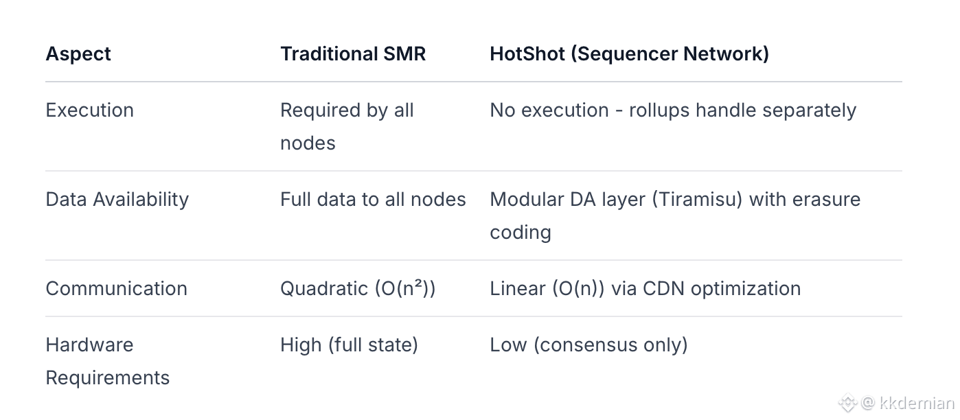 Espresso's core innovation is HotShot - a leaderless, optimistic BFT consensus protocol specifically designed for sequencing (not execution). The architecture fundamentally differs from traditional state machine replication systems: