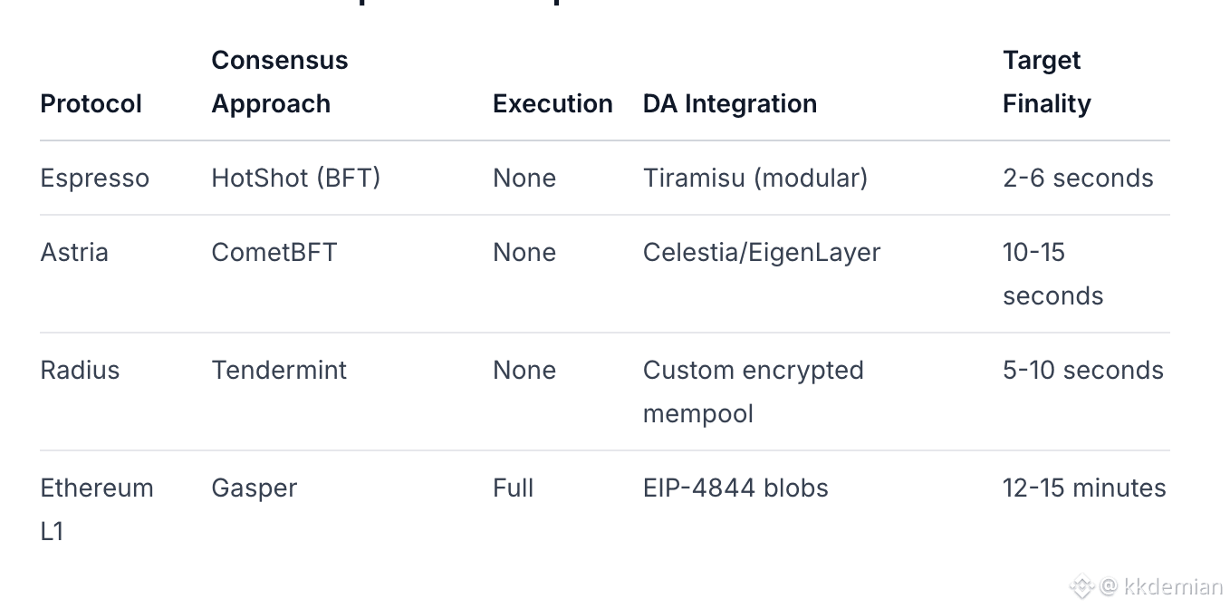 Espresso's differentiation lies in its purpose-built design for the sequencing use case, optimized latency through CDN architecture, and seamless integration between consensus and DA layers.